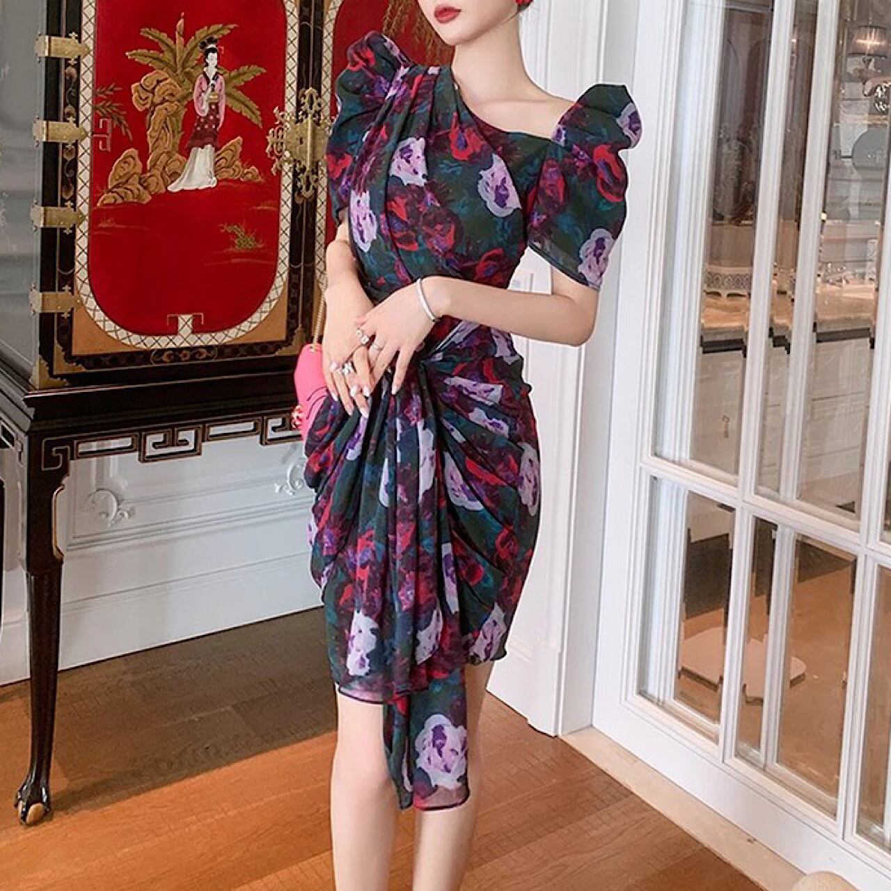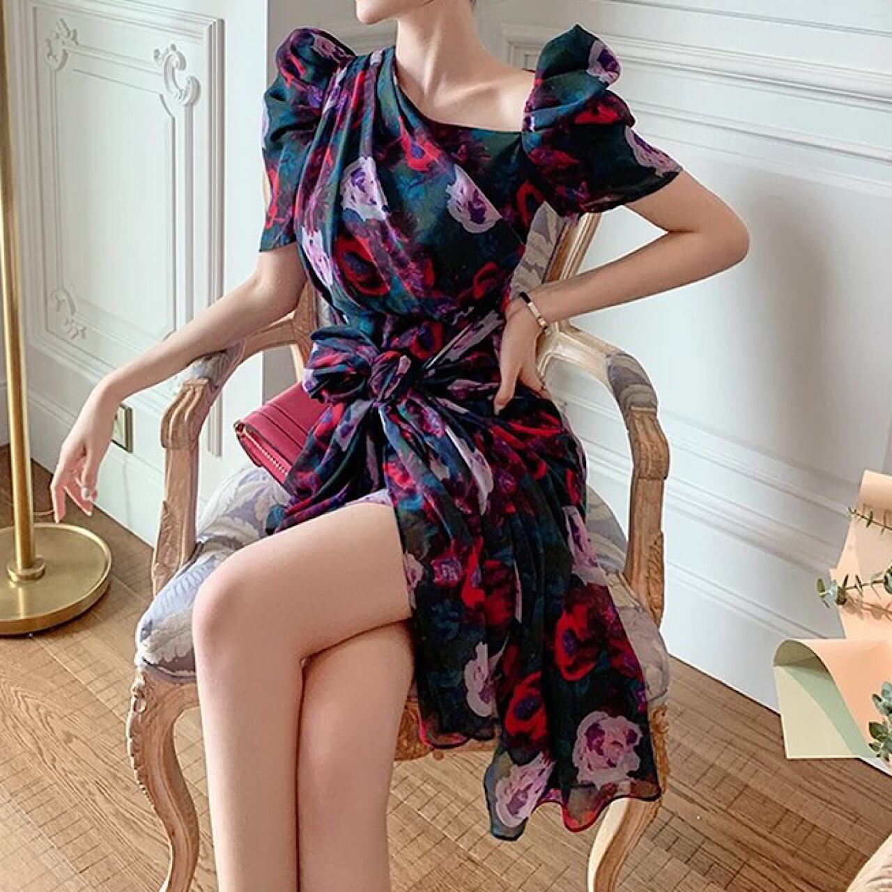 シフォン ウエストリボン パフスリーブ ミニワンピース